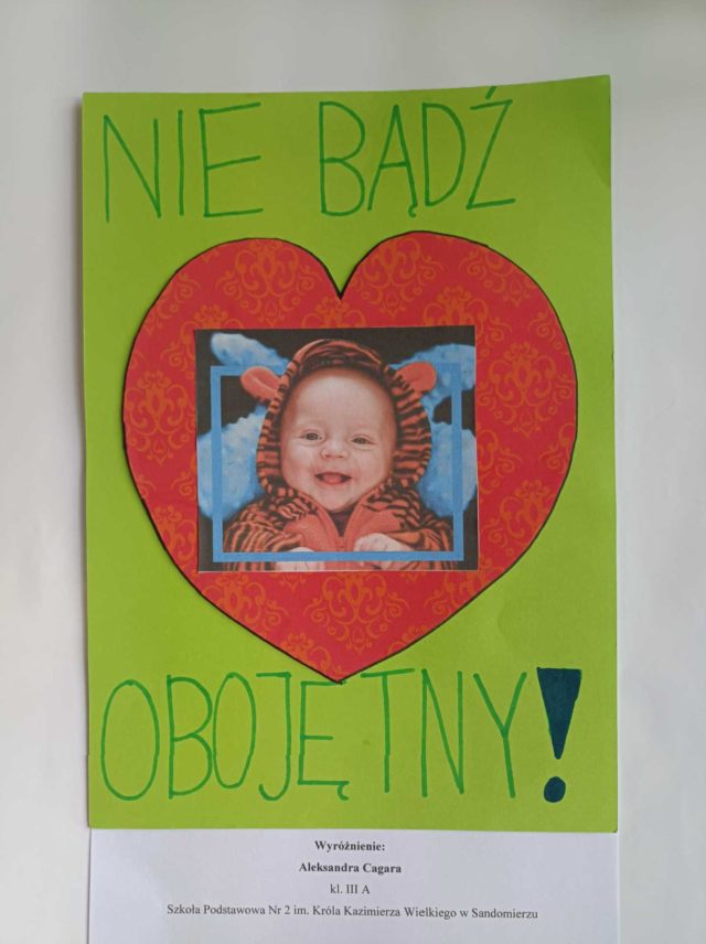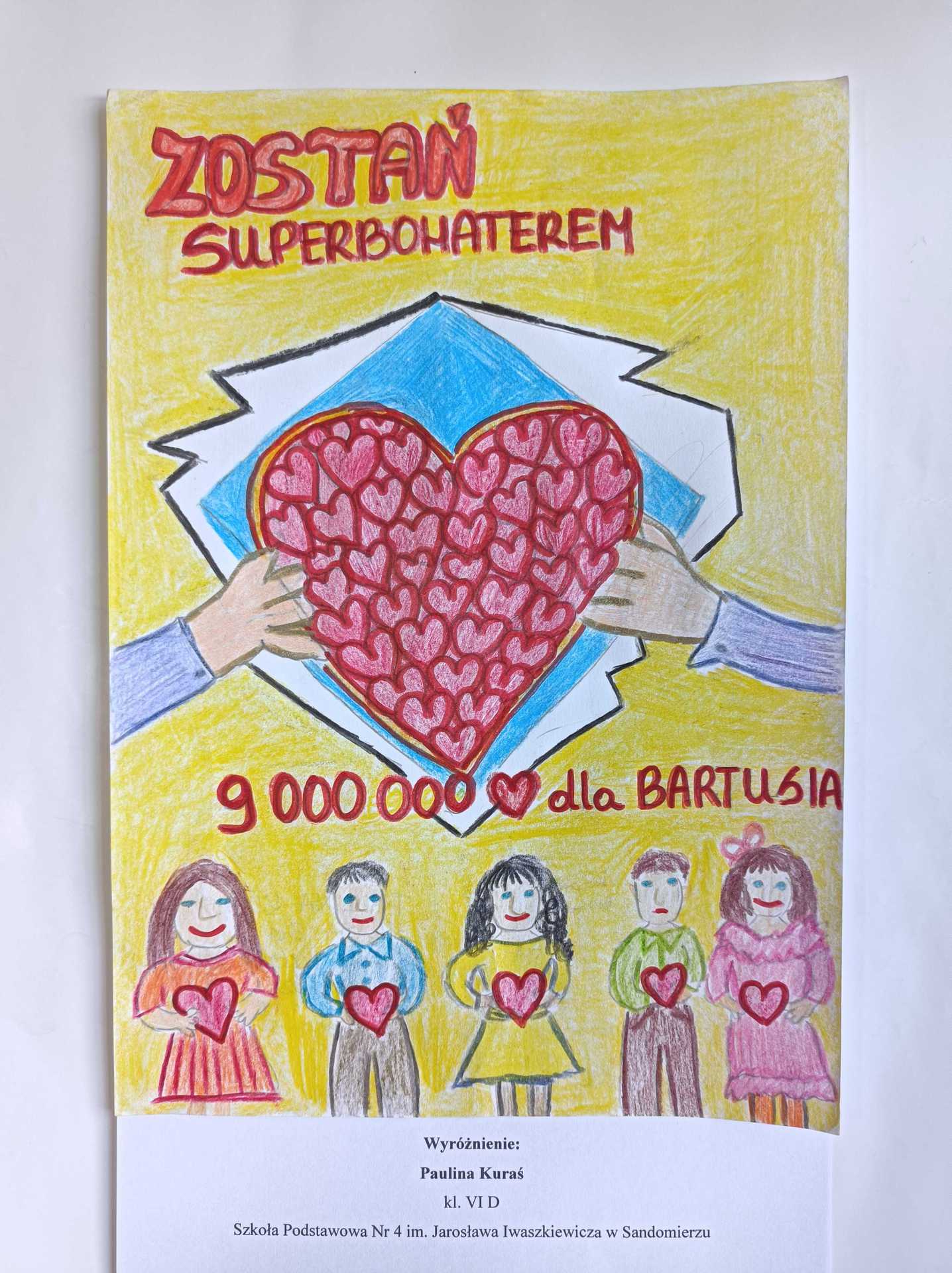 Z przyjemnością informujemy, że konkurs plastyczny pn. „9 MILIONÓW SERC DLA BARTUSIA – DOBRO POWRACA” został rozstrzygnięty. Celem konkursu było rozwijanie u dzieci ich wrażliwości na pomoc innym, promowanie działań charytatywnych, budowanie cech mających na celu niesienie pomocy potrzebującym w sposób bezinteresowny i dobroczynny, kreatywne i twórcze spędzanie czasu wolnego oraz rozwój umiejętności plastycznych. Do udziału w konkursie można było zgłaszać prace o tematyce ZACHĘCENIA DO UDZIAŁU W POMOCY BARTUSIOWI PRZYCHODZKIEMU, CHOREMU CHŁOPCU NA SMA – RDZENIOWY ZANIK MIĘŚNI, nawiązujące do tematu konkursu. Konkurs przeznaczony został dla uczniów klas I-VIII sandomierskich szkół podstawowych. Organizatorem konkursu był Komitet Społeczny Rycerze Bartusia Kontra SMA we współpracy z Sandomierskim Centrum Kultury.