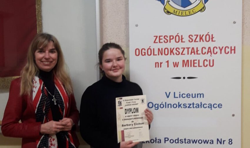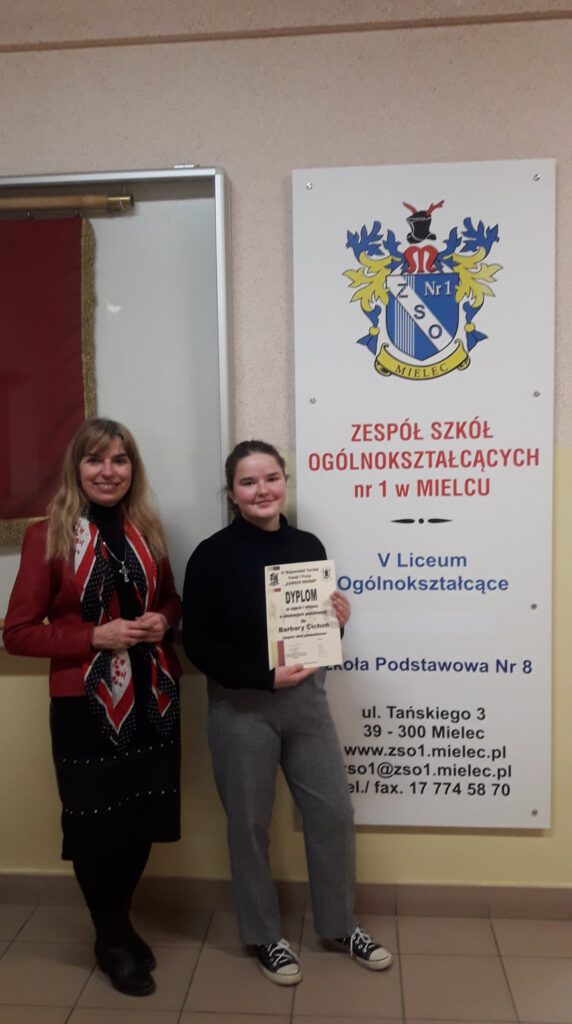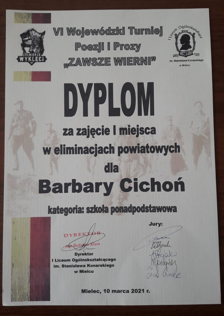 Z radością i dumą informujemy, że Barbara Cichoń, reprezentująca Szkolny Wolontariat V Liceum Ogólnokształcącego w Mielcu zajęła I miejsce w Powiatowym etapie VI edycji Konkursu Zawsze Wierni, przywracającego pamięć o Żołnierzach Wyklętych Niezłomnych, organizowanym przez I LO w Mielcu. Dało to nominację do etapu wojewódzkiego, w którym Barbara Cichoń zajęła III miejsce. Godnie prezentowały też nasz Wolontariat na etapie powiatowym recytatorki: Magda Nowak i Oliwia Dąbrowska. Do konkursu uczennice przygotowywały się pod kierunkiem opiekuna Wolontariatu – dr Jolanty Witek. Gratulujemy i życzymy kolejnych sukcesów! W tym roku eliminacje odbywały się w formie zdalnej.