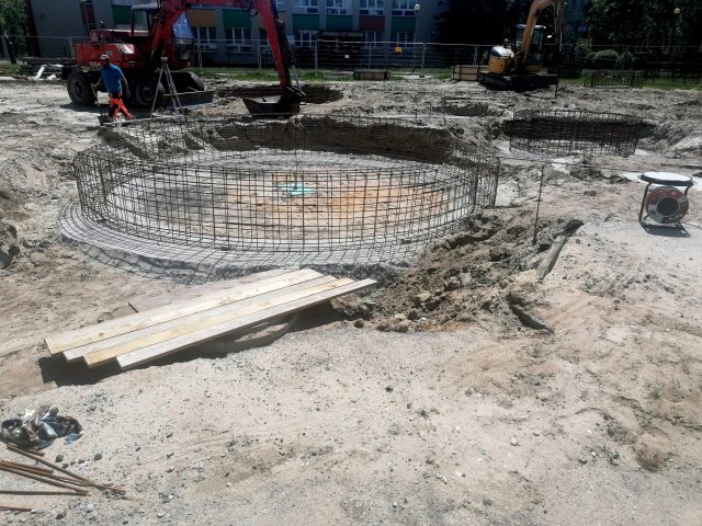 Prace ziemne i rozbiórkowe na terenie przy Alejach Jana Pawła II 6 wykonane są obecnie w około 50 %, a w około 60% roboty związane z kanalizacją sanitarną, deszczową i doprowadzeniem wody. Wykonane zostały przyłącza wodociągowe wraz ze studnią wodomierzową do fontann, kanalizacja deszczowa (bez drenażu), przyłącza kanalizacji sanitarnej, komora technologiczna pod automatykę fontann. Na chwilę obecną Wykonawca przygotowuje zbrojenie oraz szalunki ławek oraz fontanny. Trwają również ustalenia w sprawie technologii fontanny.