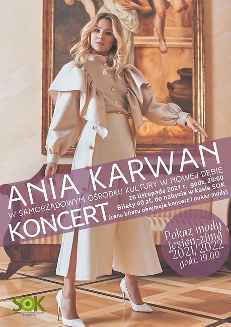 ANIA KARWAN – zwyciężczyni konkursu Premiery 56 Festiwalu Polskiej Piosenki w Opolu. Przebój „Słucham Cię w radiu co tydzień” przyniósł Artystce aż trzy nagrody – za najlepszy tekst, kompozycję oraz nagrodę główną jury w konkursie „Premiery”. W 2020 roku utwór uzyskał również status podwójnej platynowej płyty. Debiutancka płyta Ani ukazała się 15 lutego 2019 r.dając fanom Artystki też takie przeboje, jak „Głupcy” który pokrył się platyną, czy „Czarny Świt” uhonorowany złotą płytą. Artystka została nominowana do Fryderyków 2020 w kategorii „Fonograficzny debiut roku”, a w 2021 płyta „Ania Karwan” osiągnęła status złotej płyty. Ania firmuje swoim nazwiskiem także utwór do filmu „The Secret Game”. Produkcję Watchout Studio nagrodzono na Festiwalu Polskich Filmów Fabularnych w Gdyni Nagrodą Specjalną Jury. Ania Karwan szerszej publiczności dała poznać się podczas VII edycji programu „The Voice of Poland” z 2016 roku, w którym dotarła do ścisłego finału. Podczas przesłuchań „w ciemno” brawurowo wykonała utwór „Purple Rain” z repertuaru Prince’a, odwracając wszystkie cztery jurorskie fotele. Występ Ani był muzycznym wydarzeniem, nic więc dziwnego, że został dostrzeżony również na świecie zajmując wysokie miejsce w prestiżowym międzynarodowym zestawieniu TOP TEN GLOBAL VOICE 2016. Ania na scenie obecna jest od kilkunastu lat, z powodzeniem grając koncerty w Polsce i za granicą oraz współpracując z czołówką polskich artystów, jak również światowymi kompozytorami muzyki filmowej przy Festiwalu Muzyki Filmowej. Jej głos od lat można usłyszeć w licznych produkcjach filmowych i serialowych, takich jak: „Listy do M”, „Pitbull”, „Planeta Singli”, czy „Legendy Polskie”, gdzie wspólnie z Matheo przypomniała przebój Zdzisławy Sośnickiej „Aleja Gwiazd”.