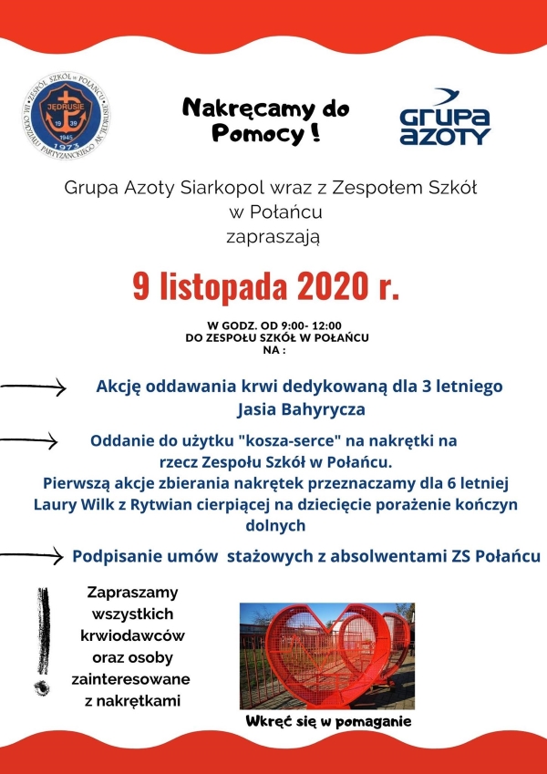 - Oddanie do użytku „kosza-serce” na nakrętki na rzecz Zespołu Szkół w Połańcu.
