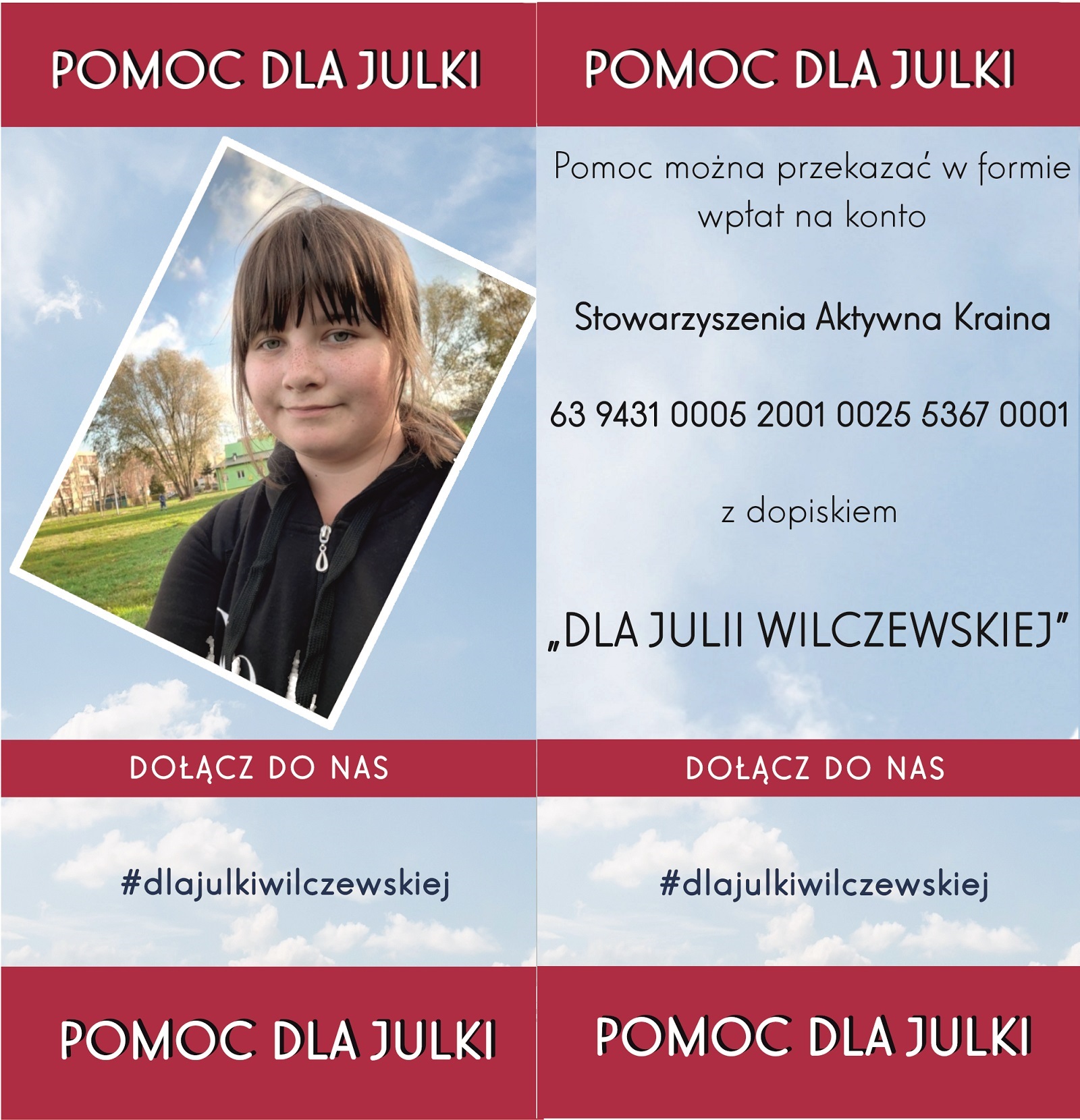 Pomoc można przekazywać również w formie wpłat na konto Stowarzyszenia Aktywna Kraina 63 9431 0005 2001 0025 5367 0001 z dopiskiem „Dla Julii Wilczewskiej”.