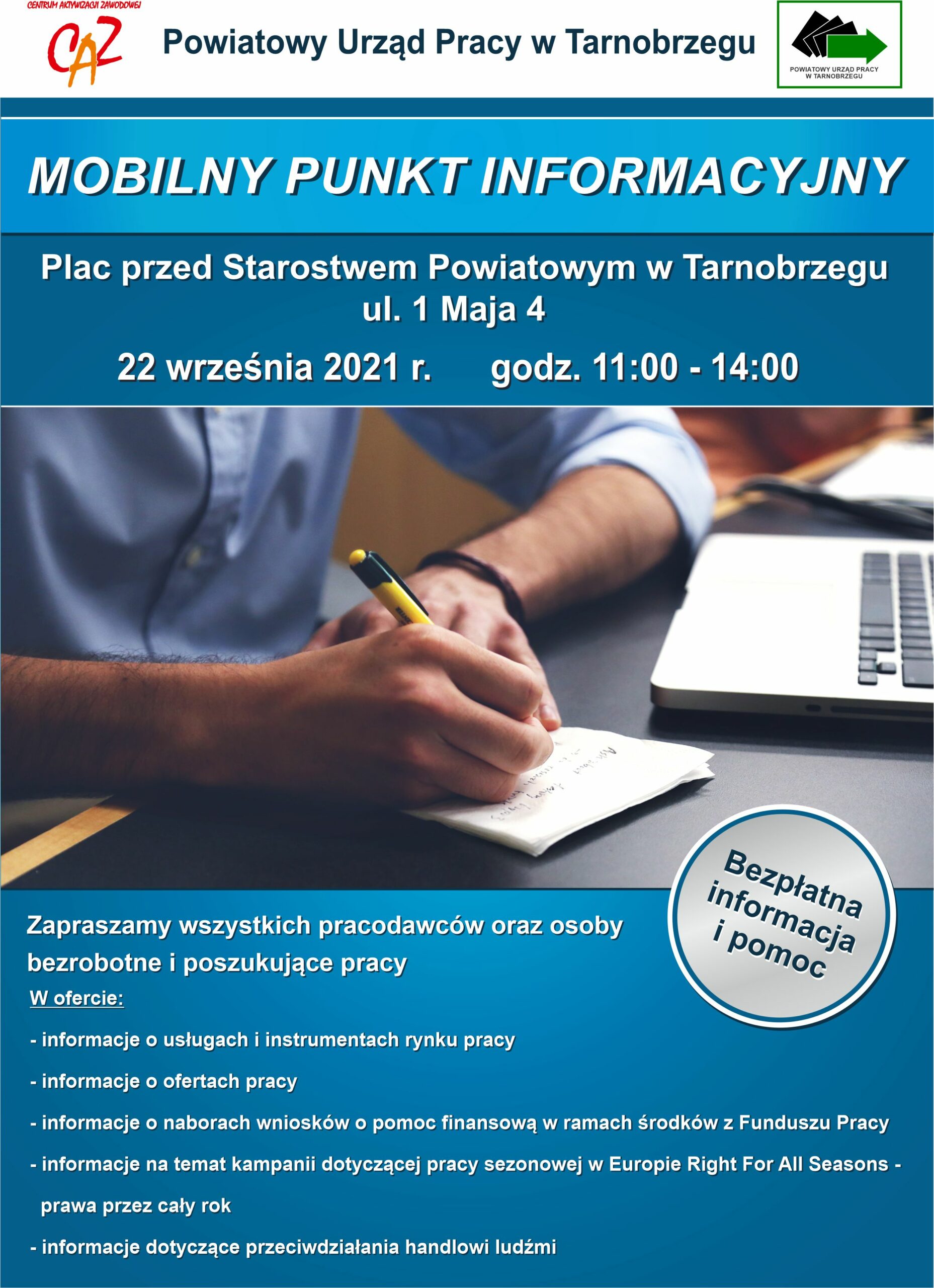 Powiatowy Urząd Pracy w Tarnobrzegu zaprasza do Mobilnego Punktu Informacyjnego na Placu przed Starostwem Powiatowym w dniu 22.09.2021 r. w godzinach od 11.00 do 14:00.