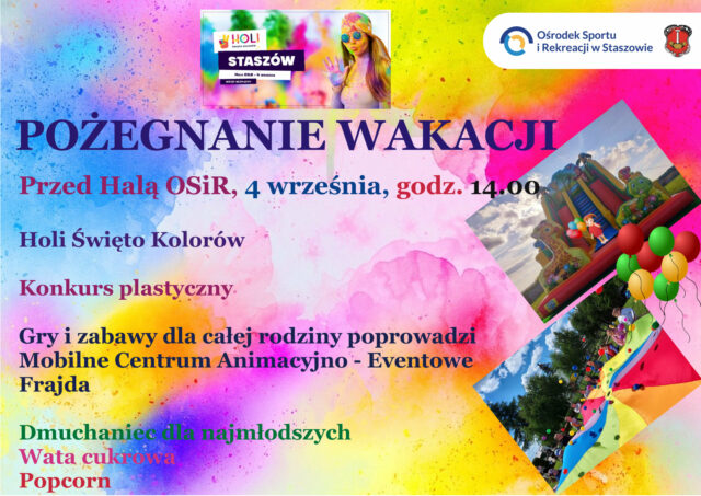 W związku z niekorzystnymi warunkami atmosferycznymi Holi Święto Kolorów i Pożegnanie Wakacji przed Halą Ośrodka Sportu i Rekreacji w Staszowie zostają przeniesione na 4 września ( sobota) na godzinę 14.00. Serdecznie zapraszamy.