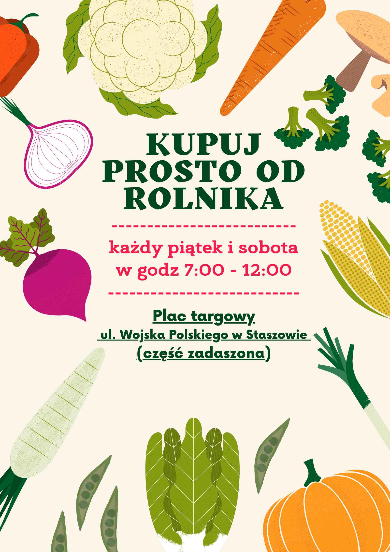 W piątki i soboty łatwo kupimy świeże produkty prosto od rolnika. Zapraszamy sprzedawców ze swoimi artykułami oraz mieszkańców chętnych na świeże zakupy. Plac targowy przy ul. Wojska Polskiego w Staszowie (część zadaszona) jest czynny w każdy piątek i sobotę od godz. 7:00 do godz. 12:00.