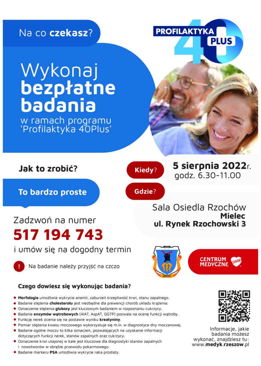 Zapraszamy na bezpłatne badania w ramach programu “Profilaktyka 40Plus”, 5 sierpnia w godzinach 6.30 – 11.00 sala osiedla Rzochów ul. Rynek Rzochowski 3 w Mielcu. Program skierowany jest do osób powyżej 40 roku życia. Dzwoniąc na numer tel: 517 194 743 można umówić się na dogodny termin. Na badanie należy przyjść na czczo.
