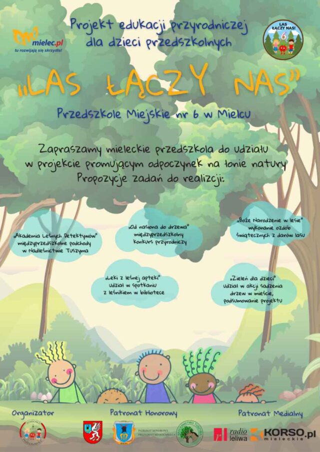Przedszkole Miejskie Nr 6 w Mielcu realizuje projekt „Las łączy nas”, który ma na celu upowszechnianie edukacji przyrodniczej, leśnej a także m.in. rozwijanie wyobraźni, koncentracji uwagi i zdolności twórczego myślenia wśród najmłodszych. Do udziału w projekcie zaproszone są wszystkie mieleckie przedszkola publiczne.