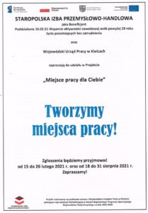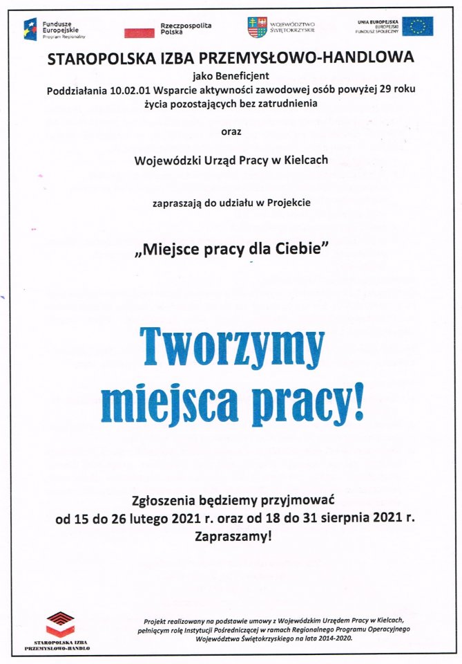 Staropolska Izba Przemysłowo-Handlowa na podstawie Umowy zawartej z Wojewódzkim Urzędem Pracy w Kielcach realizuje projekt „Miejsce pracy dla Ciebie” w ramach Działania 10.2.1 Regionalnego Programu Operacyjnego Województwa Świętokrzyskiego na lata 2014-2020.