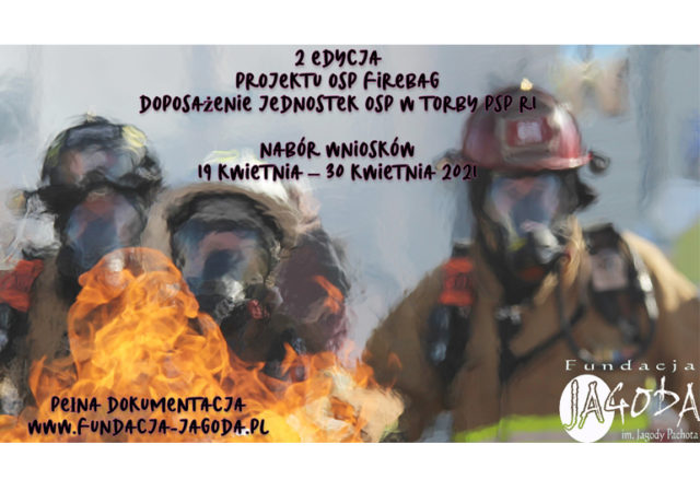 Fundacja JAGODA zaprasza do udziału w naborze wniosków II edycji Projektu OSP Firebag. Projekt skierowany jest do wszystkich jednostek Ochotniczych Straży Pożarnych z terenu całej Polski.