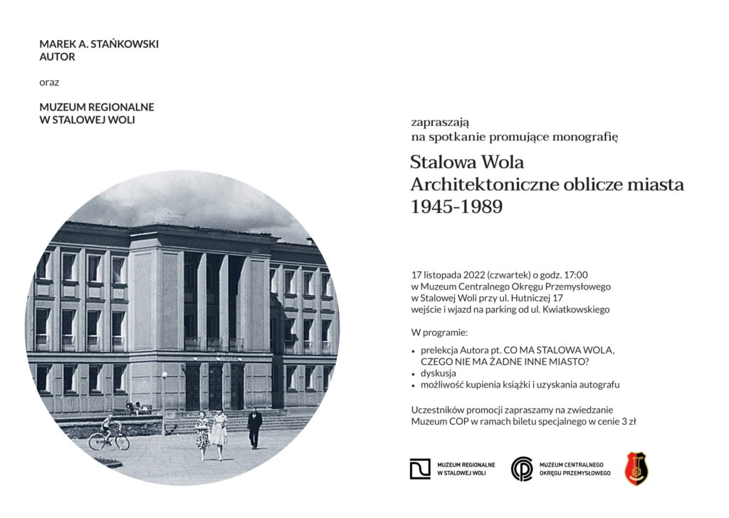 Prezydent Miasta Stalowej Woli Lucjusz Nadbereżny zaprasza na spotkanie promujące monografię Marka A. Stańkowskiego „Stalowa Wola Architektoniczne oblicze miasta 1945-1989”, które odbędzie się 17 listopada 2022 (czwartek) o godz. 17:00 w Muzeum Centralnego Okręgu Przemysłowego w Stalowej Woli przy ul. Hutniczej 17. W programie prelekcja Autora pt. „Co ma Stalowa Wola, a czego nie ma żadne inne miasto?”, dyskusja oraz możliwość zakupu książki i uzyskania autografu. Uczestnicy promocji będą mogli zwiedzić muzeum Muzeum COP w ramach biletu specjalnego w cenie 3 zł.