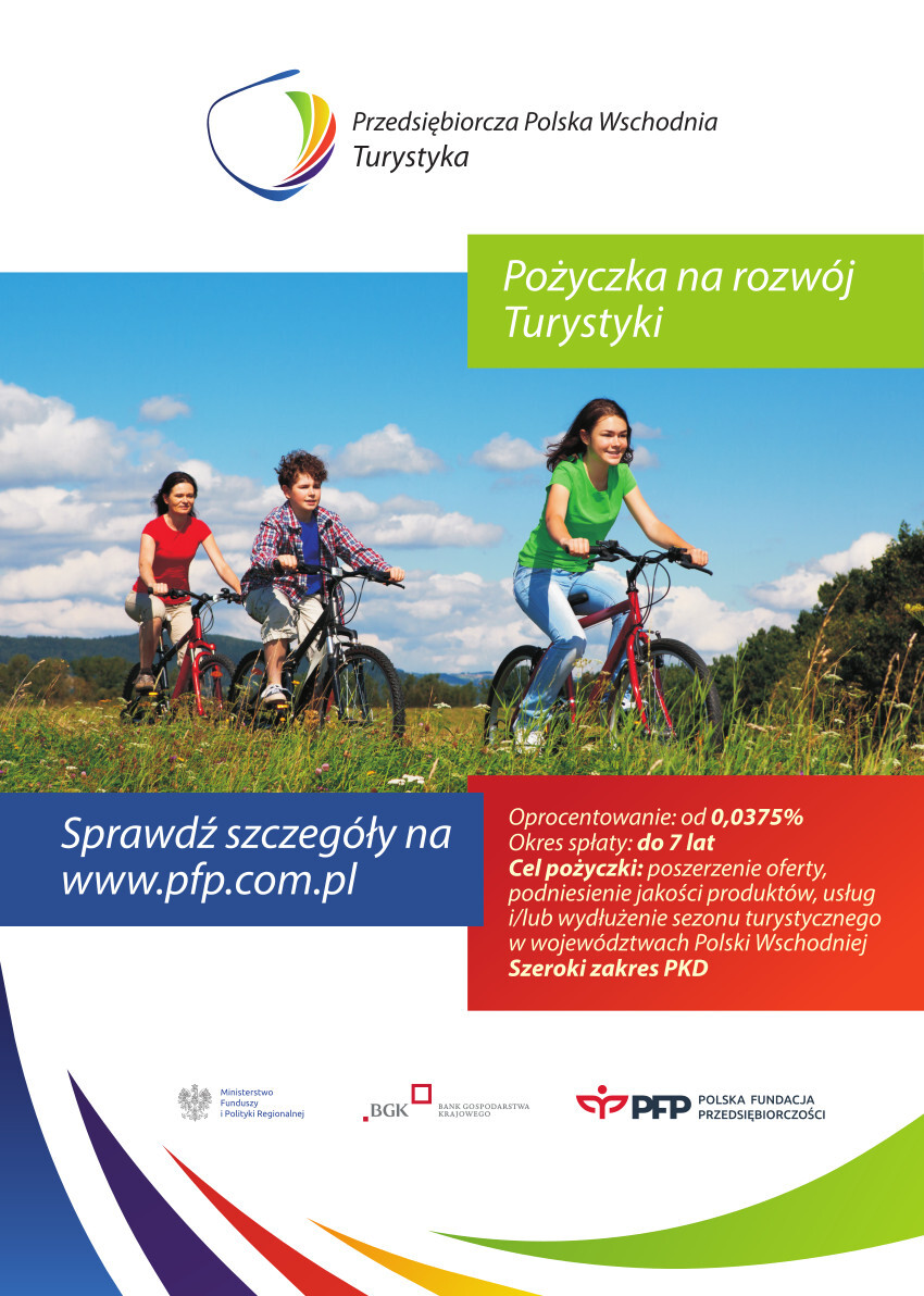 Pożyczka na rozwój turystyki umożliwia mikro-, małym i średnim firmom prowadzącym działalność turystyczną lub okołoturystyczną na terenie Polski Wschodniej (województwo świętokrzyskie, podkarpackie, lubelskie, warmińsko-mazurskie, podlaskie) sfinansowanie rozwojowych przedsięwziąć oraz wydatków związanych z prowadzeniem działalności gospodarczej. Jako przedsiębiorca, może wnioskować o nisko oprocentowaną pożyczkę o wartości do 500 tys. zł.