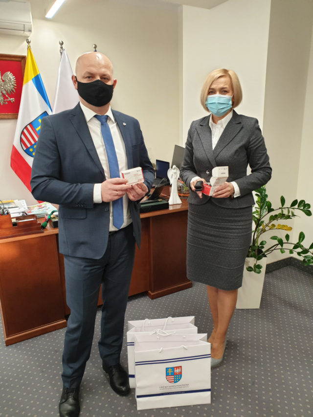 Pulsoksymetry z rąk Renaty Janik – Wicemarszałek Województwa Świętokrzyskiego odebrał Burmistrz Miasta i Gminy Szydłów Andrzej Tuz. Zostaną wkrótce przekazane do jednostek podległych, związanych z ochroną zdrowia na terenie naszej gminy.
