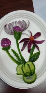 My rozpoczęliśmy od warsztatów z CARVINGU czyli fantazyjnego zdobienia warzywami i owocami. Na wstępie prowadząca, pani Jolanta Grabiec, zapoznała uczestników z historią sztuki carvingu, zasadami i stylami tej sztuki, narzędziami (typami i rodzajami noży), zabezpieczeniem i pielęgnacją wykonanych prac oraz przedstawiła krótką prezentację kompozycji przez siebie zrobionych. Następnie, z przygotowanych warzyw i owoców, po dokładnym instruktażu i pod czujnym okiem prowadzącej, powstawały fantazyjne dekoracje. Pierwszego dnia uczestnicy wykonali kwiaty z pomidora, róża z kalarepy oraz fantazyjne kompozycje z ogórka. Drugiego dnia powstały pawie z jabłka zdobione jagodami, kiwi i innymi owocami lub warzywami (według uznania) oraz bukiety na bazie cebuli, ogórka, pomidorków koktajlowych. Po wykonaniu prac, uczestnicy mieli za zadanie ułożyć swoje prace artystycznie na talerzu. Powstały piękne, kolorowe kompozycje, które tak zachwyciły uczestników, że zadeklarowali poznanymi sposobami ozdobić wielkanocne stoły. Natomiast prowadząca wyrzeźbiła dla nas wspaniałego arbuza z logo PCK i programu SeniorON.