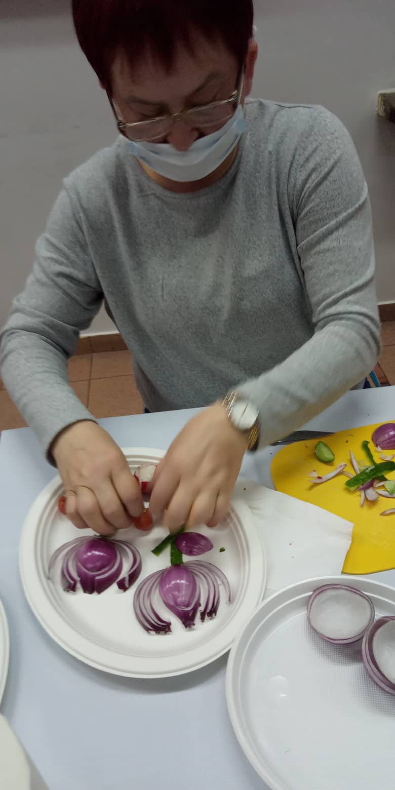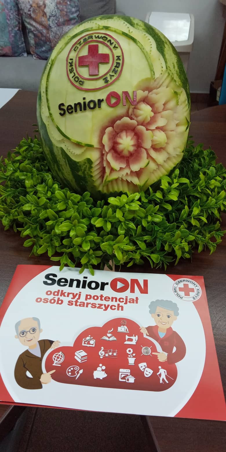My rozpoczęliśmy od warsztatów z CARVINGU czyli fantazyjnego zdobienia warzywami i owocami. Na wstępie prowadząca, pani Jolanta Grabiec, zapoznała uczestników z historią sztuki carvingu, zasadami i stylami tej sztuki, narzędziami (typami i rodzajami noży), zabezpieczeniem i pielęgnacją wykonanych prac oraz przedstawiła krótką prezentację kompozycji przez siebie zrobionych. Następnie, z przygotowanych warzyw i owoców, po dokładnym instruktażu i pod czujnym okiem prowadzącej, powstawały fantazyjne dekoracje. Pierwszego dnia uczestnicy wykonali kwiaty z pomidora, róża z kalarepy oraz fantazyjne kompozycje z ogórka. Drugiego dnia powstały pawie z jabłka zdobione jagodami, kiwi i innymi owocami lub warzywami (według uznania) oraz bukiety na bazie cebuli, ogórka, pomidorków koktajlowych. Po wykonaniu prac, uczestnicy mieli za zadanie ułożyć swoje prace artystycznie na talerzu. Powstały piękne, kolorowe kompozycje, które tak zachwyciły uczestników, że zadeklarowali poznanymi sposobami ozdobić wielkanocne stoły. Natomiast prowadząca wyrzeźbiła dla nas wspaniałego arbuza z logo PCK i programu SeniorON.
