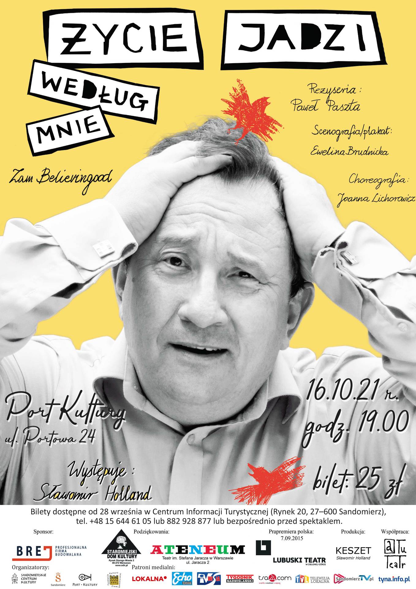 Sandomierskie Centrum Kultury oraz Fundacja Kultury Ziemi Sandomierskiej zapraszają na spektakl Sławomira Hollanda pt. „Życie Jadzi według mnie”, który odbędzie się 16 października (sobota) o godz. 19:00 w Porcie Kultury przy ul. Portowej 24.