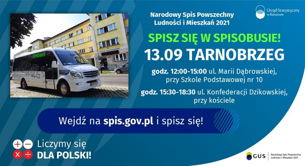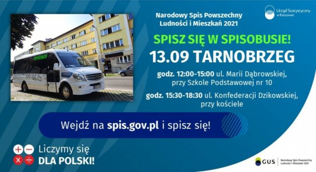 13 września br. do Tarnobrzega dotrze spisobus z Urzędu Statystycznego w Rzeszowie. Spis, w ramach Narodowego Spisu Powszechnego Ludności i Mieszkań 2021, prowadzony będzie w dwóch lokalizacjach: