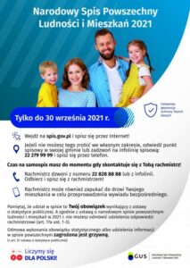 Uwaga! Czas na samodzielnie spisanie się w Narodowym Spisie Powszechnym Ludności i Mieszkań 2021 masz do momentu, gdy skontaktuje się z Tobą rachmistrz – nie czekaj do 30 września! Pamiętaj, że udział w spisie to twój obowiązek.