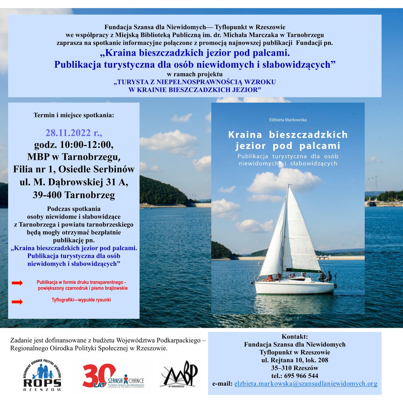 Fundacja „Szansa dla Niewidomych”-Tyflopunkt w Rzeszowie we współpracy z Miejską Biblioteką Publiczną im. dr. M. Marczaka w Tarnobrzegu zaprasza wszystkie osoby zainteresowane, w szczególności z dysfunkcją wzroku z Tarnobrzega i powiatu tarnobrzeskiego, na spotkanie informacyjne połączone z promocją najnowszej publikacji „Kraina bieszczadzkich jezior pod palcami”.