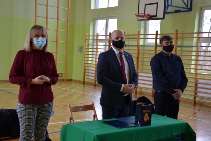 Burmistrz wręczył okolicznościowe podziękowania i upominki, przekazał także życzenia od Marszałka Województwa Świętokrzyskiego Andrzeja Bętkowskiego. Włodarz podzielił się informacjami na temat ostatnich i planowanych w najbliższym czasie inwestycji. Podkreślił, że urząd miasta, pomimo pandemii jest cały czas otwarty dla mieszkańców, z zachowaniem rygorów sanitarnych. Po krótkiej dyskusji na temat funduszu sołeckiego i pracy sołtysa podczas pandemii, uczestnicy spotkania zwiedzili pozostałe, wyremontowane pomieszczenia szkolne.
