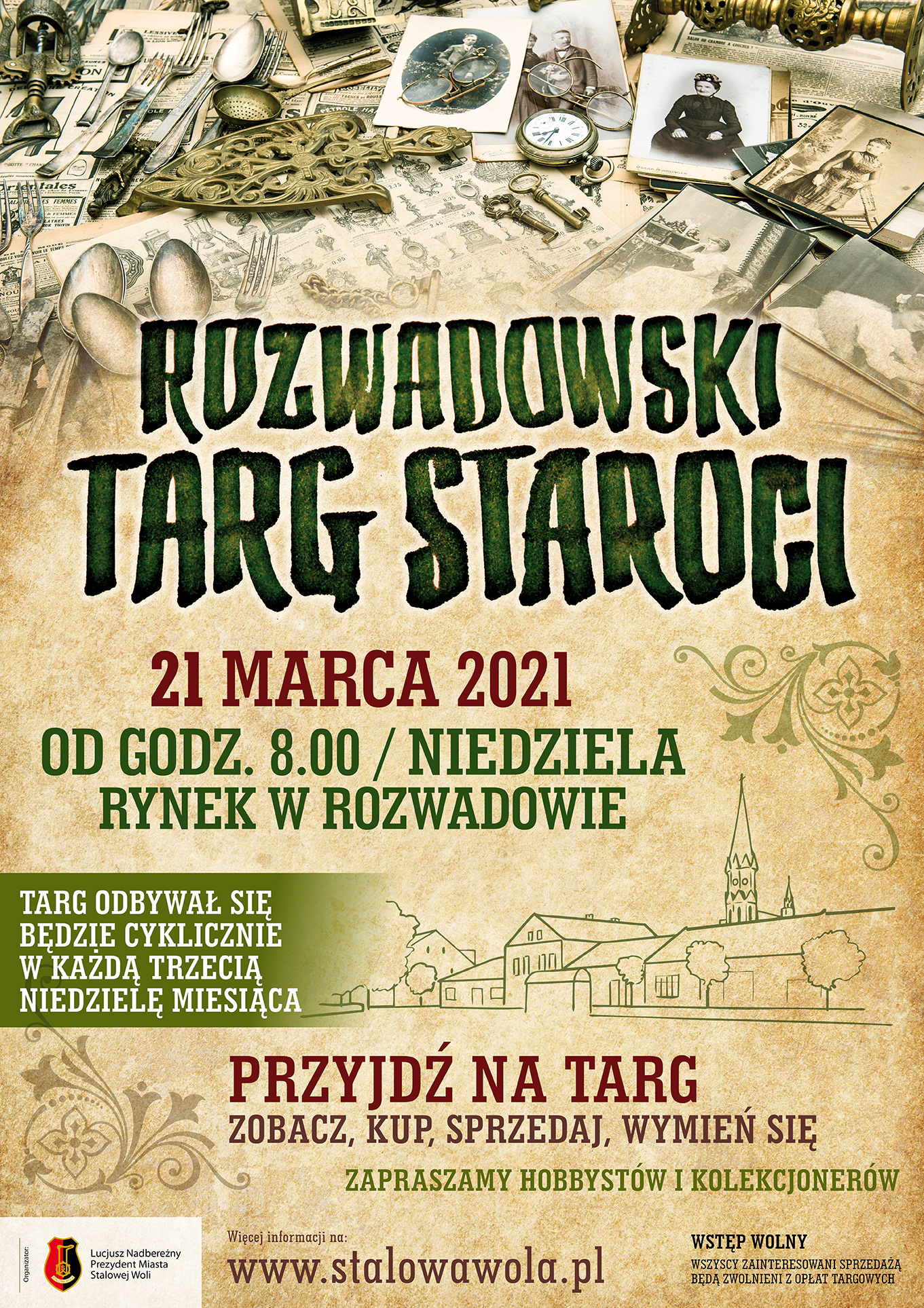 Najbliższy Targ Staroci odbędzie się w niedzielę 21 marca. Aby wystawić swoje przedmioty na sprzedaż należy skontaktować się z Wydziałem Promocji, Kultury i Sportu pod numerem telefonu (15) 847 93 16 lub wysłać zgłoszenie na adres e-mail: mpleszka@stalowawola.pl. Regulamin dostępny jest TUTAJ. Sprzedający zwolnieni są z opłat targowych, a wstęp na Targ jest bezpłatny.