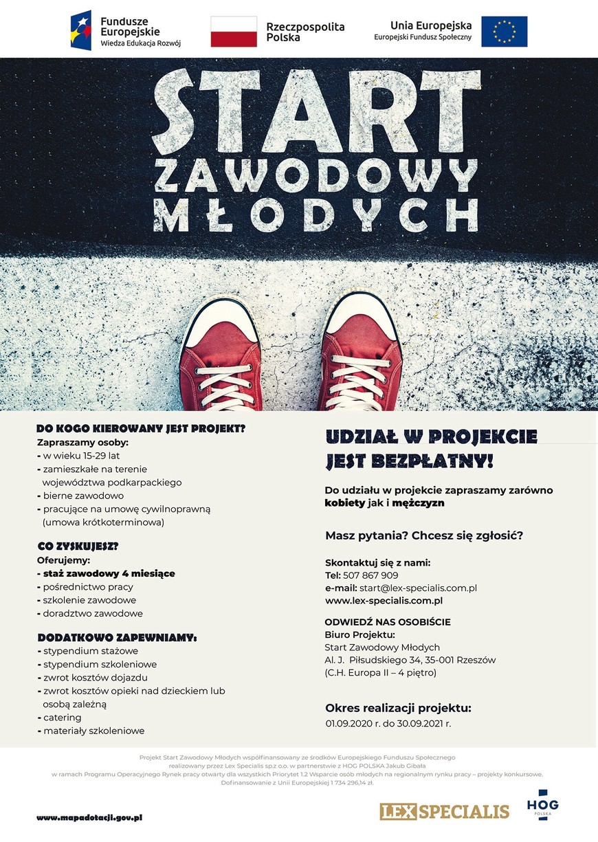 Projekt Start Zawodowy Młodych realizowany jest przez LEX SPECIALIS sp. z o.o. w partnerstwie z HOG POLSKA Jakub Gibała w ramach Programu Operacyjnego Rynek pracy otwarty dla wszystkich Priorytet 1.2 Wsparcie osób młodych na regionalnym rynku pracy – projekty konkursowe.