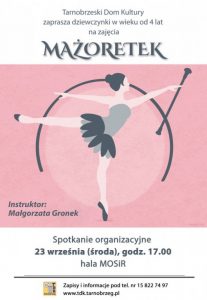 Rozpoczyna się również nowy nabór do grupy mażoretek. Zajęcia poprowadzi Małgorzata Gronek – doświadczona instruktorka, choreograf, międzynarodowa sędzia sportu mażoretkowego. Będą to zajęcia o charakterze marszowo-tanecznym, z elementami akrobatyki i gimnastyki, rolsy (kręcenie, żonglerka) pałeczką – batonem. W warsztatach mogą wziąć udział dziewczynki nawet od 4. roku życia.
