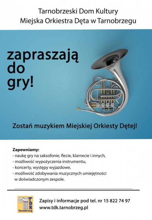 Istnieje także możliwość dołączenia do Miejskiej Orkiestry Dętej. Oferta skierowana jest do osób już grających, ale również istnieje możliwość rozpoczęcia nauki gry od podstaw, a nawet wypożyczenia instrumentu. Orkiestra to grupa muzyczna z wieloletnią tradycja, prestiżowa, która daje wiele możliwości rozwoju i zdobycia nowych doświadczeń.