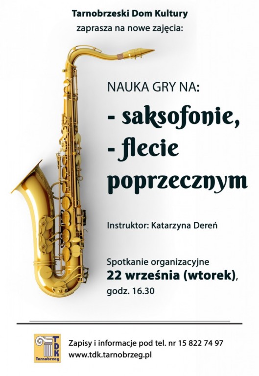 Sekcja muzyczna TDK-u zostanie wzmocniona o nowe instrumenty – saksofon i flet poprzeczny. Lekcje nauki gry poprowadzi Katarzyna Dereń – magister sztuki, animatorka kultury, kapelmistrzyni, saksofonistka i flecistka. Tutaj także mogą się zgłaszać osoby, które chcą rozpocząć naukę oraz zaawansowani muzycy.