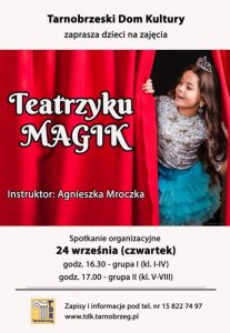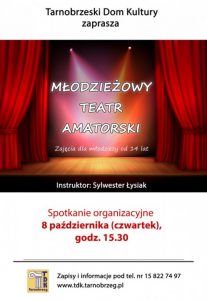 Startują także zajęcia teatralne dla wszystkich grup wiekowych: od kilkulatków po seniorów. W TDK-u działa bowiem kilka grup teatralnych. Teatrzyk Magik to zajęcia sceniczne dla najmłodszych, które prowadzi Agnieszka Mroczka. Każdy sezon kończy się realizacją spektaklu, dzięki czemu uczestnicy mogą poczuć się jak prawdziwi aktorzy. Podobnie jest z Młodzieżowym Teatrem Amatorskim, który prowadzi Sylwester Łysiak. Również tutaj można realizować swoje pasje, pracując nad dykcją, gestem i ruchem scenicznym, a na koniec sezonu zaprezentować efekty swojej pracy na scenie.