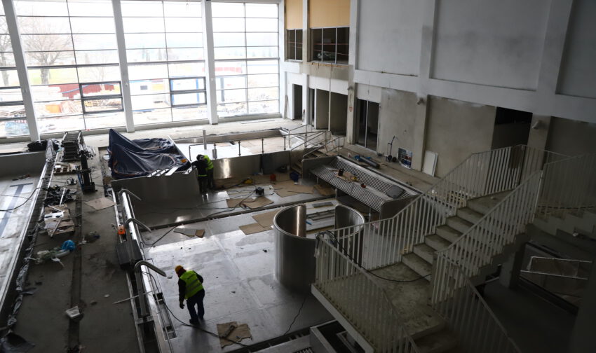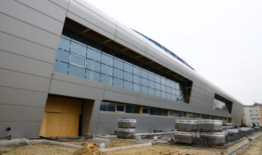 Wykonawca niestety ciągle nie uporał się z opóźnieniami w dostawie szyb, które mają zamknąć przestrzeń pod kopułą dachu hali. Obecnie deklarowany termin montażu szyb, to luty bieżącego roku. Mimo tego kontynuowane są prace zarówno wewnątrz obiektu jak i w jego otoczeniu.