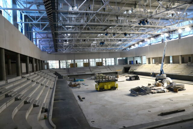 W budynku hali trwa wykonywanie posadzek z płytek gres, okładzin ścian z płytek ceramicznych , betonowych posadzek, ścian gipsowo-kartonowych i sufitów podwieszanych oraz szpachlowanie i malowanie ścian. Wykonywany jest montaż drzwi wewnętrznych stalowych i w standardzie HPL, a na arenie głównej instalowane są obudowy i okładziny akustyczne ścian. Na ukończeniu są prace związane z dostawą i montażem wind osobowych.