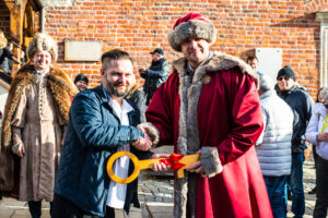 W sobotę, uroczystość rozpoczęła się oficjalnym otwarciem w Zamku Królewskim w Sandomierzu. Ta powitalna część Święta Młodego Wina 2021 została poprowadzona przez Wojciecha Giebutę – wysoko cenionego dziennikarza winiarskiego i znawcę wina. Zgodnie z tradycją, po przywitaniu gości, z dziedzińca zamkowego wyruszył winny korowód, prowadzony przez prezesa Sandomierskiego Stowarzyszenia Winiarzy – Mateusza Paciurę, na którego ręce, w ramach zaproszenia, został złożony przez Marcina Marca burmistrza Sandomierza klucz do bram miasta. Tradycja ta ma szczególne znaczenie, świadczące o przychylności i docenieniu winiarstwa na terenie ziemi sandomierskiej, nie tylko przez władze miejskie, ale też i samych sandomierzan. Barwny korowód, oprawiony muzyką Sandomierskiej Orkiestry Dętej i wsparciem Chorągwi Rycerstwa Ziemi Sandomierskiej przeprowadził gości przez Bramę Opatowską, uliczkami Starówki, aż pod Ratusz miejski.