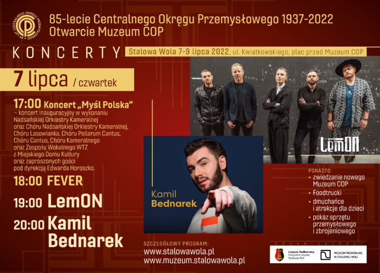 To będzie jedno z najważniejszych wydarzeń dla Stalowej Woli w 2022 roku. Już we czwartek 7 lipca w ramach obchodów 85-lecia COP-u o godzinie 15:30 będzie miała miejsca Gala otwarcia Muzeum Centralnego Okręgu Przemysłowego. Wydarzenie to swoim Honorowym Patronatem objął Prezydent Rzeczypospolitej Polskiej Andrzej Duda. Czterodniowe uroczystości odbędą się w dniach od 7 – 10 lipca w Stalowej Woli przy ul. Kwiatkowskiego, obok siedziby Muzeum COP. Organizatorem wydarzenia jest Prezydent Miasta Stalowej Woli Lucjusz Nadbereżny i Muzeum Regionalne.