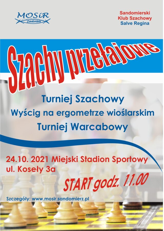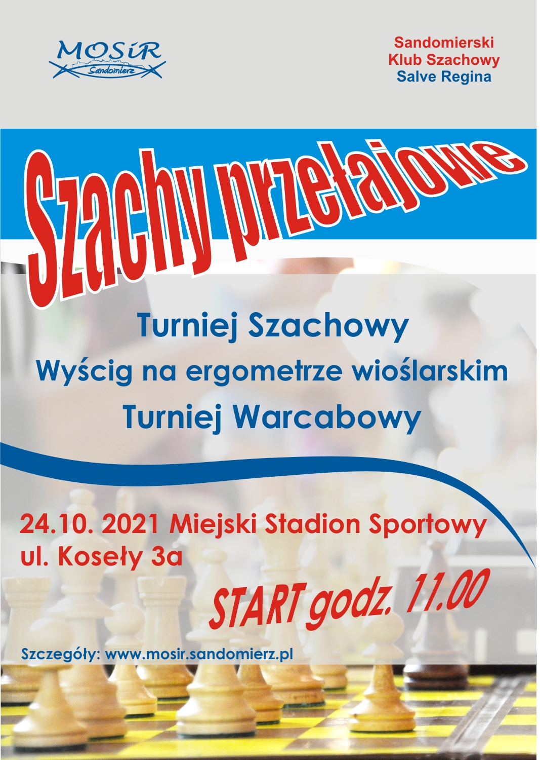 Szachy przełajowe. Turniej szachowy. Wyścig na ergometrze wioślarskim. Turniej Warcabowy. Szczegóły na plakacie