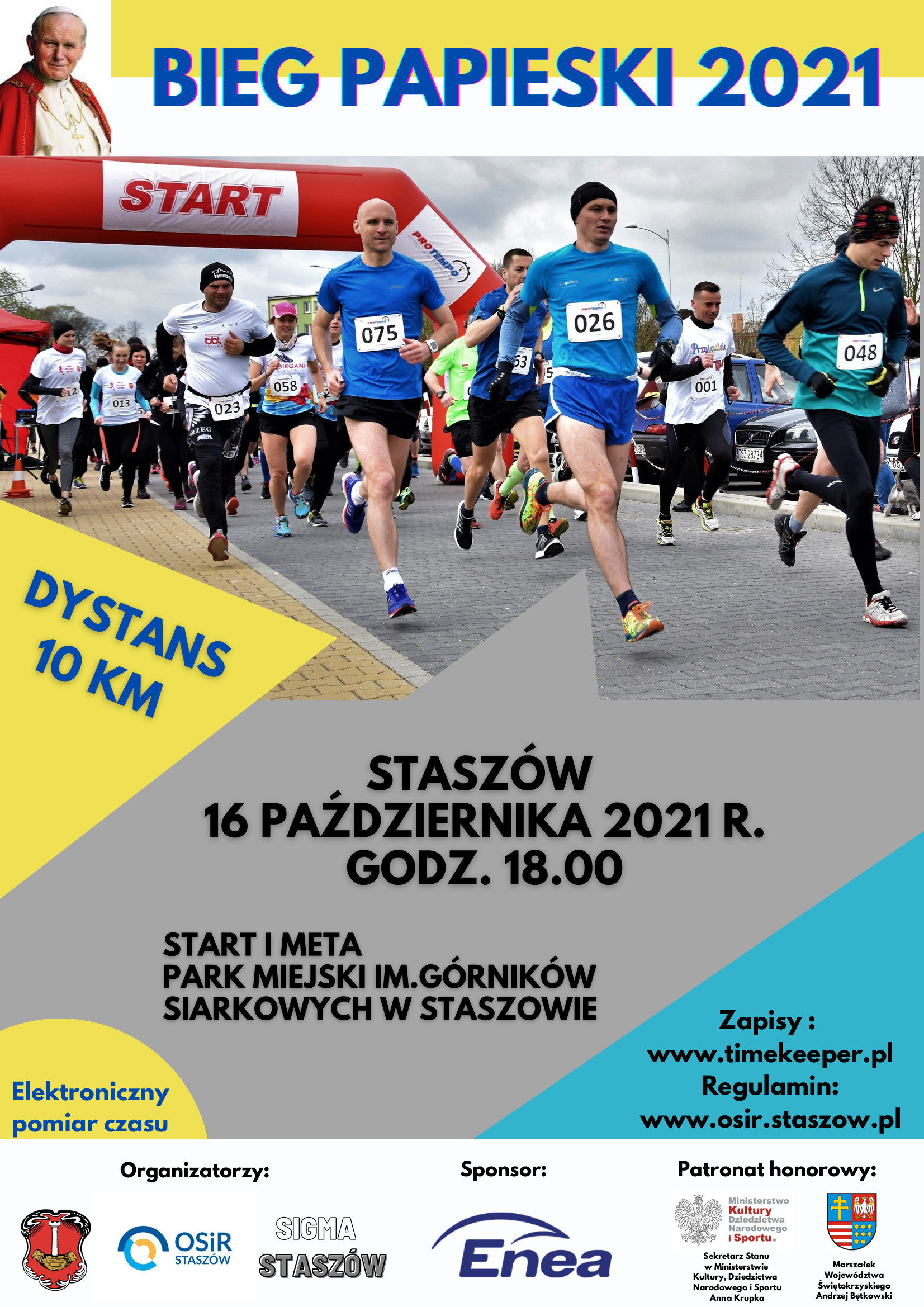 Mamy przyjemność zaprosić wszystkich miłośników biegania do udziału w Biegu Papieskim 2021. Bieg zorganizowano z myślą o młodzieży i dorosłych, którzy na sportowo chcą upamiętnić 43 rocznicę wyboru kardynała Karola Wojtyły na papieża Jana Pawła II. Kardynał Karol Wojtyła został głową kościoła katolickiego 16 października 1978. Bieg Papieski 2021 odbędzie się w rocznicę tego dnia (sobota, 16 października) w Parku Miejskim im. Górników Siarkowych w Staszowie. Do udziału w imprezie zapraszamy zarówno doświadczonych biegaczy, jak i tych początkujących oraz wszystkich, którzy mają ochotę aktywnie spędzić wolny czas. Bieg ma na celu popularyzację biegania jako najprostszej formy aktywności ruchowej, kształtowanie pozytywnych postaw i charakteru poprzez współzawodnictwo sportowe oraz świetną zabawę.