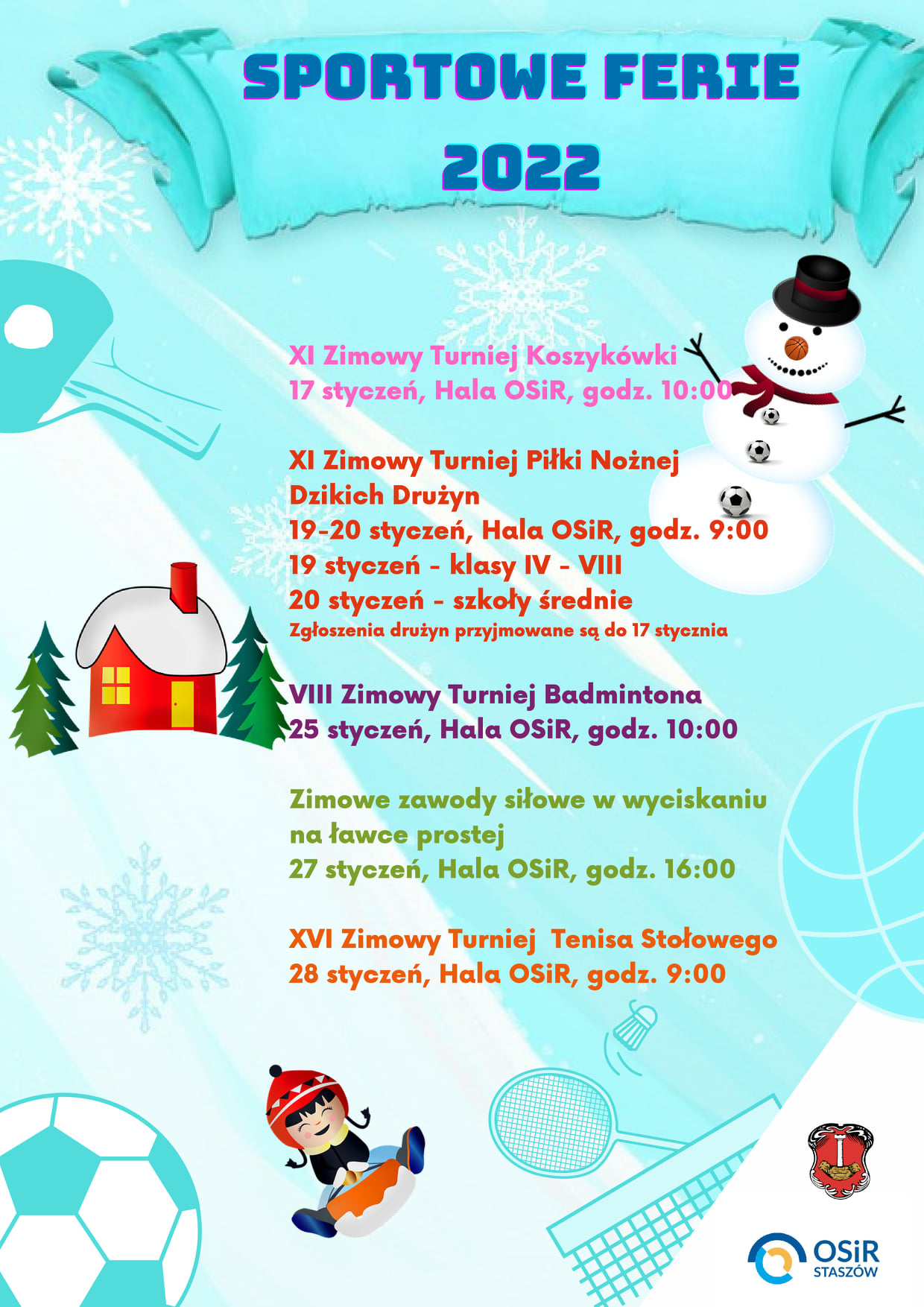 Regulaminy turniejów dostępne są na stronie: http://www.osir.staszow.pl/turniejowy-harmonogram-sportowych-ferii-2022.html