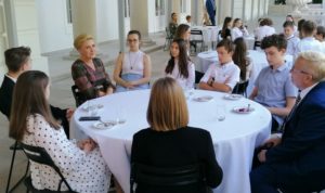 W tym ostatnim miejscu dołączyła do grupy uczniów Pierwsza Dama RP Agata Kornhauser – Duda. W czasie ponadgodzinnego spotkania z Panią Prezydentową uczniowie mieli okazję podzielić się swoimi refleksjami m.in. na temat nauki zdalnej oraz powrotu do szkół. Przed Panią Prezydentową wystąpili też: Wiktor Mądry – laureat konkursów recytatorskich oraz Julia Kuduk, która recytowała wiersz Jana Brzechwy “Leń” w gwarze śląskiej.