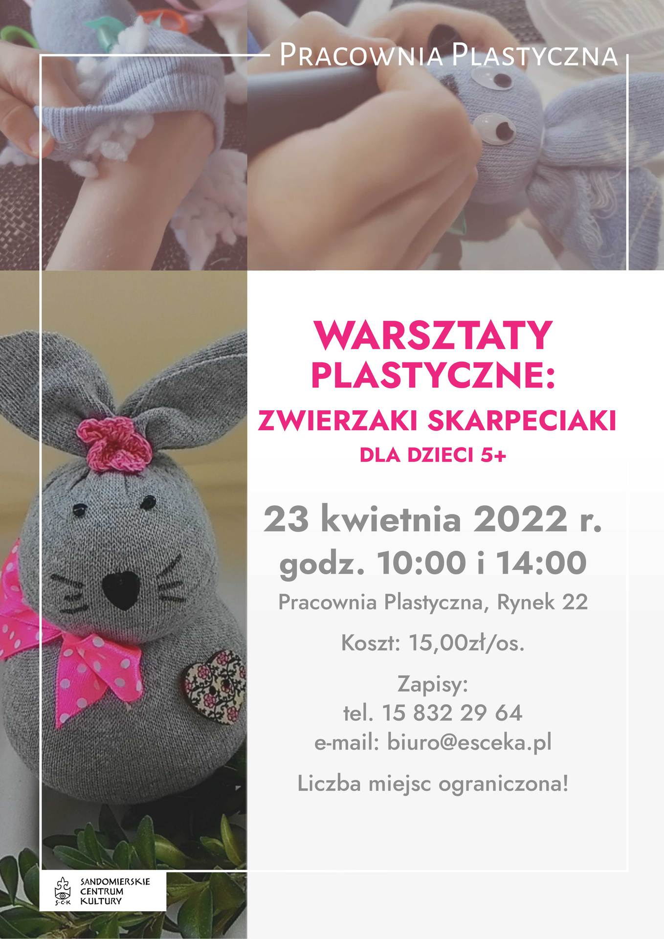 Sandomierskie Centrum Kultury zaprasza na warsztaty plastyczne pt. „Zwierzaki Skarpeciaki”, które odbędą się w sobotę, 23. kwietnia, o godz. 10:00 (gr. 1) i 14:00 (gr.2), w Pracowni Plastycznej przy ul. Rynek 22. Tym razem uczestnicy wykonają tytułowe zwierzaki przy użyciu prostych materiałów – mięsistych polarowych i bawełnianych skarpetek, sypkiego granulatu, kolorowych tasiemek i nożyczek. W ten sposób powstanie milutka i wesoła przytulanka, którą dzieci mogą wszędzie ze sobą zabrać lub podarować komuś wyjątkowemu. Rozwinie się także wyobraźnia, precyzja i sprawność manualna uczestników. Serdecznie zachęcamy do zapisów!