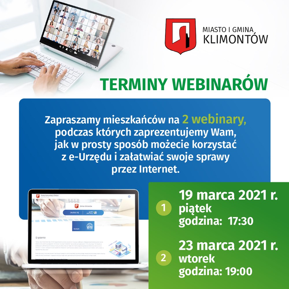 Burmistrz Miasta i Gminy Klimontów zaprasza mieszkańców gminy Klimontów do udziału w webinariach. Podczas dwóch spotkań online zaprezentujemy Państwu jak w prosty sposób można korzystać z e-Urzędu i załatwić swoje sprawy przez Internet.