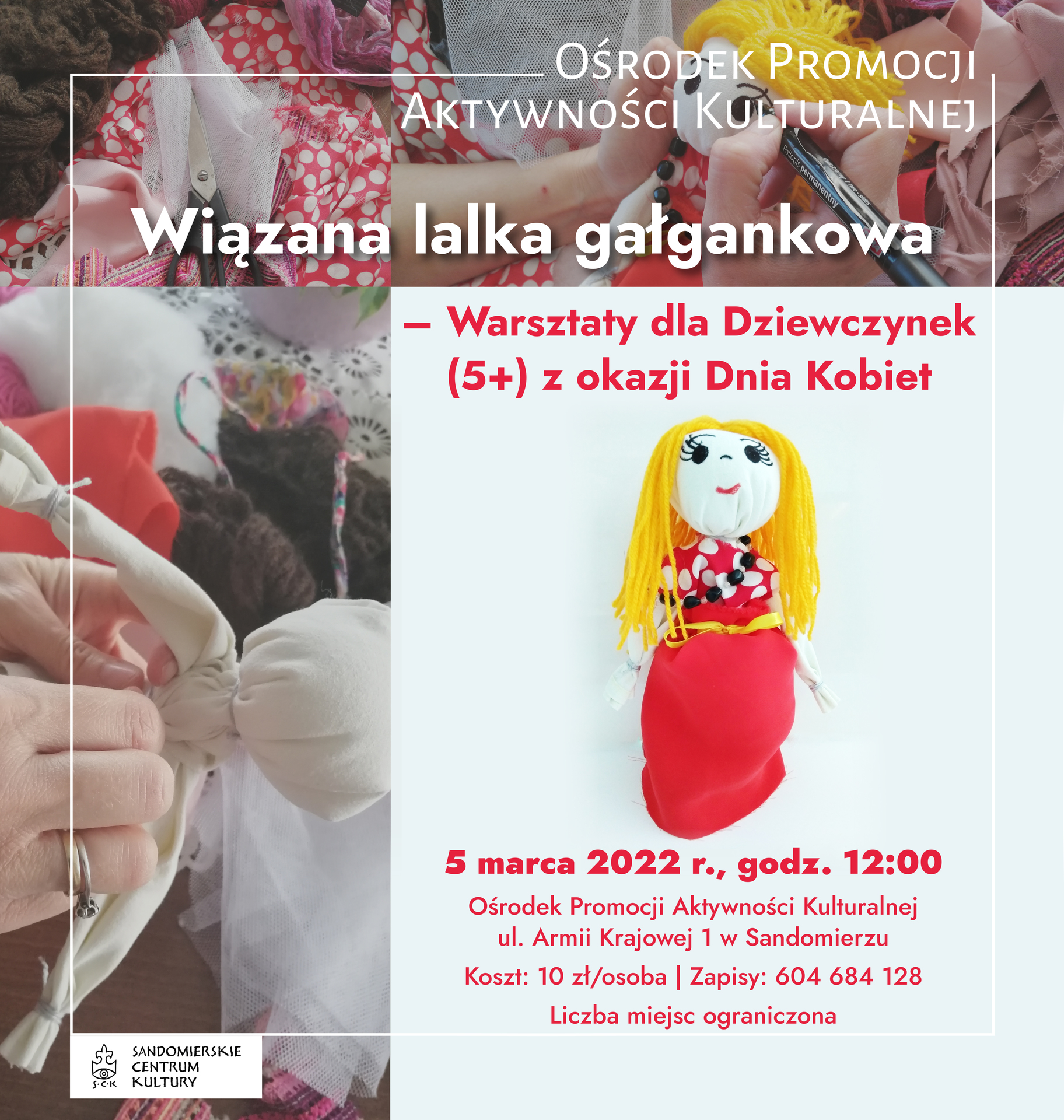 Sandomierskie Centrum Kultury zaprasza na warsztaty pn. „Wiązana lalka gałgankowa”. Oprócz warsztatów dla Pań, przygotowaliśmy z okazji Dnia Kobiet propozycję także dla Małych Kobietek! Zapraszamy dzieci 5+ na warsztaty tworzenia wiązanej lalki gałgankowej – lalki, którą bawiły się nasze prababcie. Spotkanie odbędzie się w sobotę, 5 marca 2022 r. o godz. 12:00 w Ośrodku Promocji Aktywności Kulturalnej (ul. Armii Krajowej 1 w Sandomierzu).