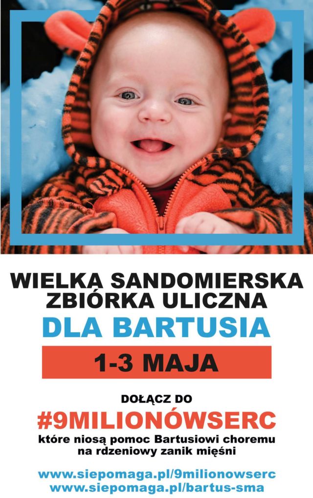 Zapowiada się inna niż wszystkie majówka w Sandomierzu. W dniach 1-3 maja odbędzie się tam wielka zbiórka uliczna na rzecz chorego na rdzeniowy zanik mięśni Bartusia Przychodzkiego, który musi zebrać ponad 9 milionów złotych na najdroższy lek świata – nowoczesną terapię genową powstrzymującą niszczycielski pochód jego choroby. To największa od lat charytatywna zbiórka pieniędzy w regionie świętokrzyskim. Dotychczas zebrano ponad 1,6 miliona złotych, a w zbiórkę pieniędzy zaangażowało się już kilkadziesiąt tysięcy osób. To jednak za mało – potrzeba milionów ludzkich serc, które zwrócą uwagę na Bartusia i ofiarują mu swoją pomoc.