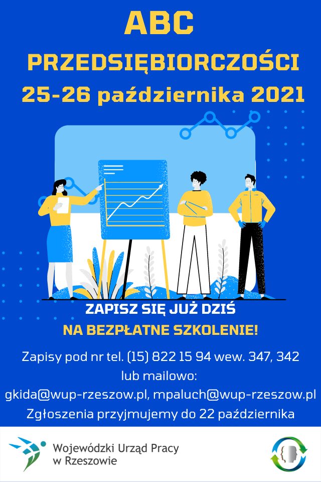 Zapraszamy na kolejną bezpłatną edycję zajęć ABC Przedsiębiorczości organizowanych przez Centrum Informacji i Planowania Kariery Zawodowej Wojewódzkiego Urzędu Pracy w Rzeszowie, w Oddziale Zamiejscowym w Tarnobrzegu, które odbędą się w dniach 25-26 października 2021 r.  Przewidywany czas trwania zajęć 9:00-14:30