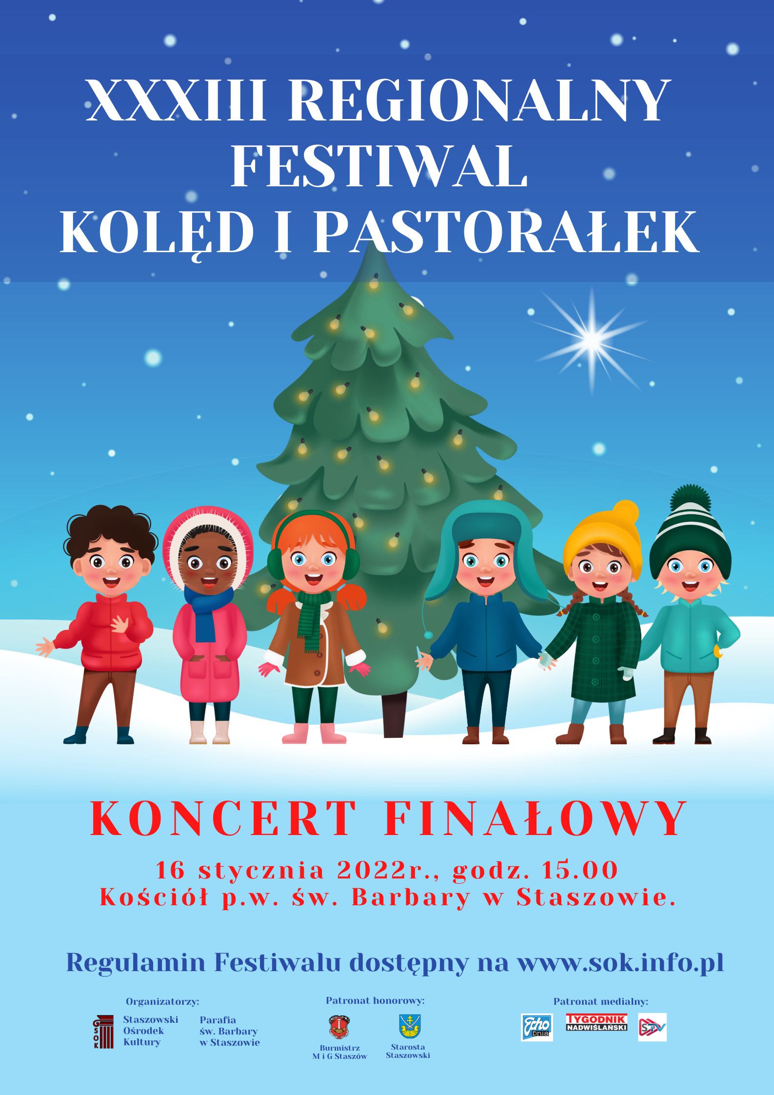 Najpiękniejsze kolędy i pastorałki zaśpiewają laureaci przeglądu, który w bieżącym roku przybrał formę konkursu. Ponadto gościnnie wystąpią: Orkiestra Dęta KiZCHS „Siarkopol” Grupa Azoty w Grzybowie, schola Parafii św. Barbary w Staszowie, chór dziecięco-młodzieżowy Staszowskiego Ośrodka Kultury.
