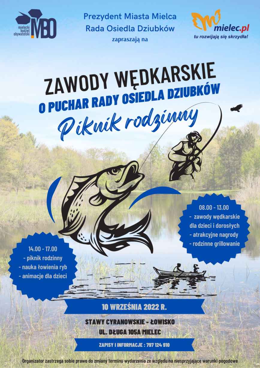 Prezydent Miasta Mielca i Rada Osiedla Dziubków  zapraszają serdecznie na piknik rodzinny i zawody wędkarskie o puchar Rady Osiedla Dziubków