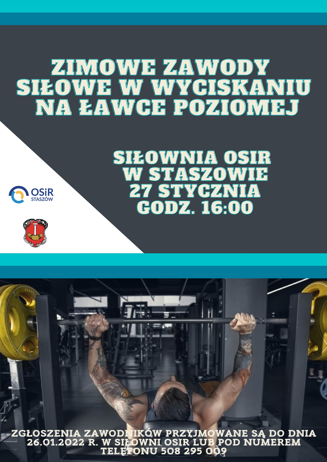 27.01.2022 r. godz. 16:00 , Siłownia Ośrodka Sportu i Rekreacji w Staszowie.