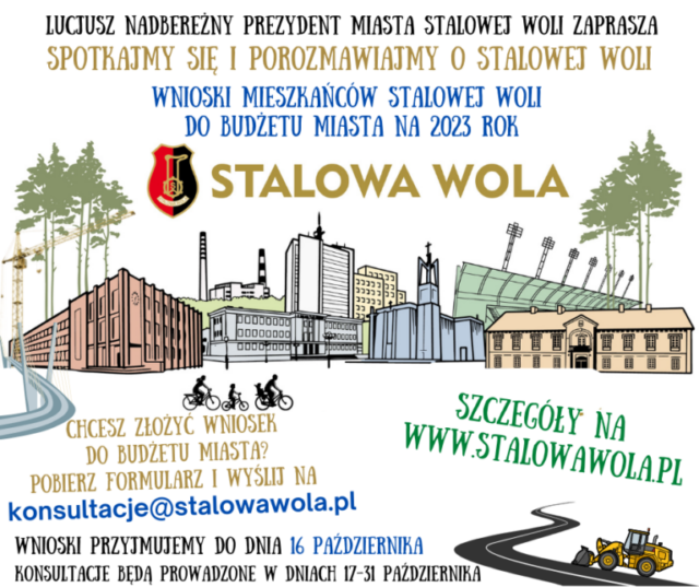 Prezydent Miasta Stalowej Woli Lucjusz Nadbereżny zaprasza mieszkańców do czynnego udziału w tworzeniu przyszłorocznego budżetu. Masz pomysł, jak usprawnić Twoje podwórko, czy dokonać zmian w przestrzeni miasta? – złóż wniosek do budżetu. Każdy, kto zechce zgłosić swoją propozycję i złożyć wniosek do budżetu miasta na 2023 rok, może to uczynić pobierając i wypełniając formularz dostępny na stronie www.stalowawola.pl. Następnie należy go wysłać na adres mailowy: konsultacje@stalowawola.pl lub przynieść osobiście do sekretariatu Urzędu Miasta przy ulicy Wolności 7 (pok. nr 35) lub przy ulicy Kwiatkowskiego 1 (pok. nr 127). Będzie również możliwość wypełnienia wniosku na miejscu.