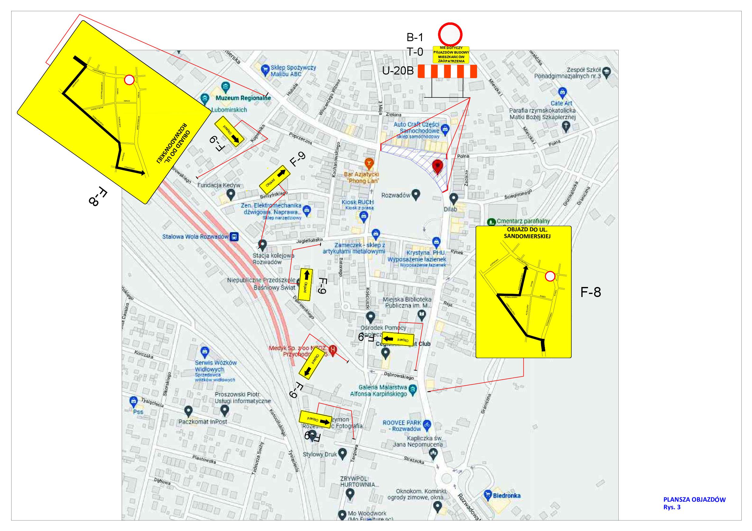 Kierowcy jadący od Stalowej Woli w kierunku Sandomierza od przyszłego tygodnia będą musieli skręcić w ul. Dąbrowskiego, następnie w ul. Jagiellońską, ul. Kochanowskiego i w lewo w ul. Broniewskiego. Natomiast zmotoryzowani uczestnicy ruchu, którzy będą chcieli wjechać do Stalowej Woli będą musieli w okolicy Muzeum Regionalnego skręcić w prawo w ul. Kopernika, następnie ul. Dąbrowskiego dojechać do ul. Targowej, by z niej skręcić w lewo w ul. Strażacką i dojechać do ul. Rozwadowskiej. Szczegóły zamknięcia części ul. Rynek i objazdu zwizualizowane są na poniższych mapach.