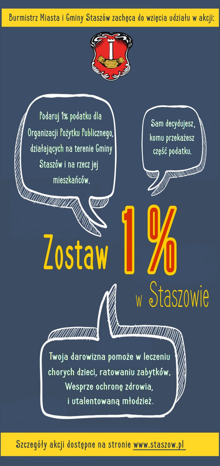 Ruszyła kolejna edycja akcji informacyjnej „Zostaw 1% w Staszowie”. Inicjatywa burmistrza Miasta i Gminy Leszka Kopcia, promuje przekazywanie części podatku od osób fizycznych na rzecz wybranej Organizacji Pożytku Publicznego. Ta forma wsparcia finansowego jest niezwykle prosta, a przekazując 1% podatku możemy pomóc większej ilości osób i instytucji, działających na terenie naszej Gminy lub na rzecz naszych mieszkańców.